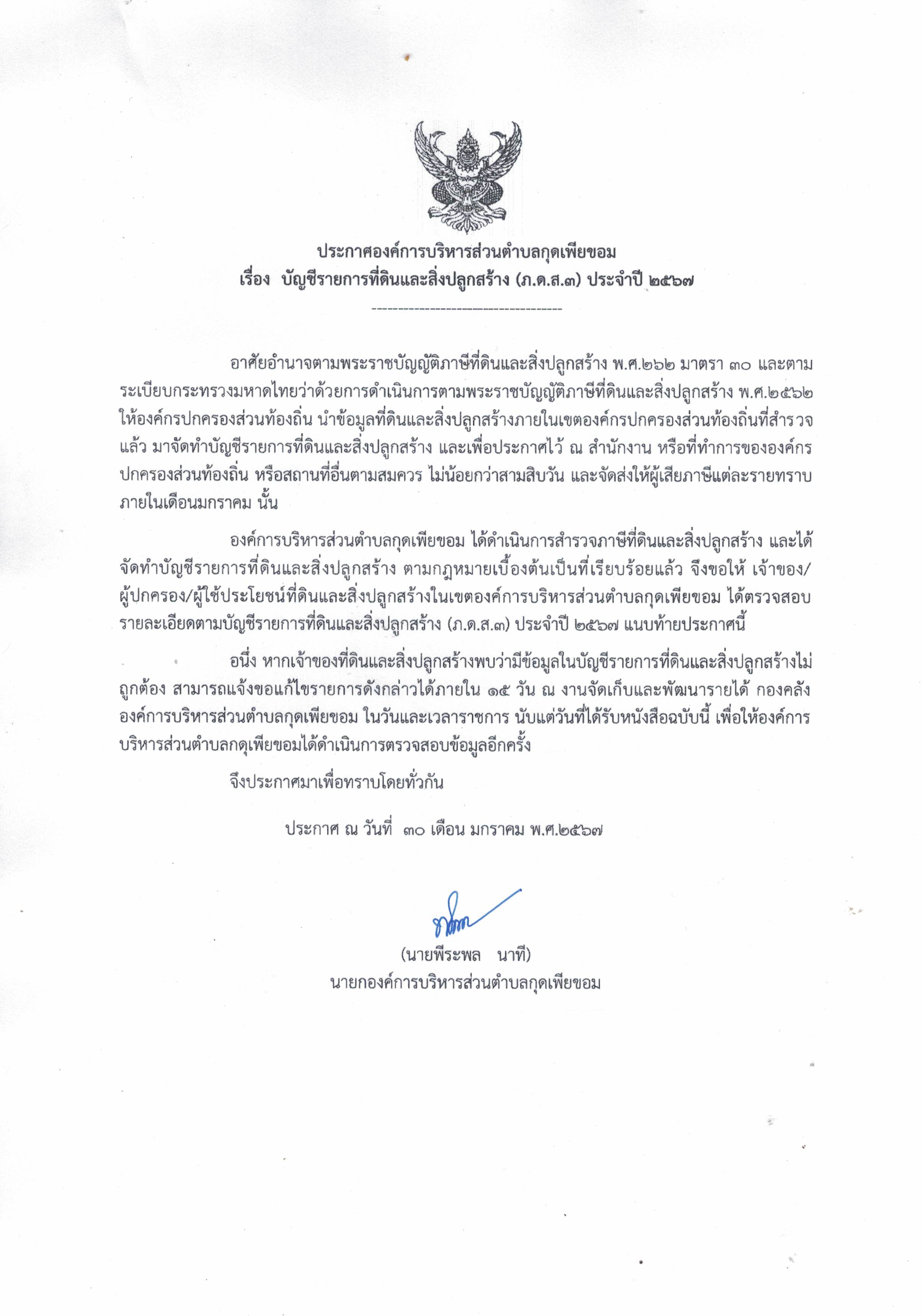 ประกาศ บัญชีรายการที่ดินและสิ่งปลูกสร้าง (ภ.ด.ส.3) ประจำปี 2567 |